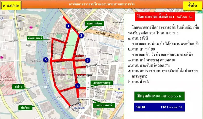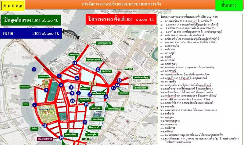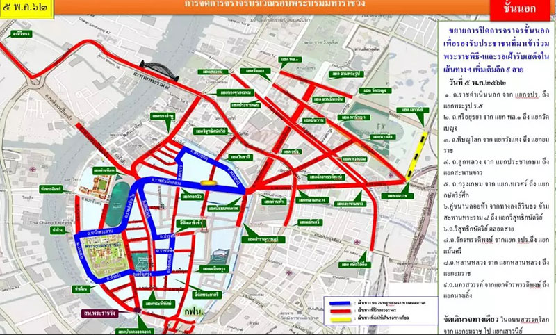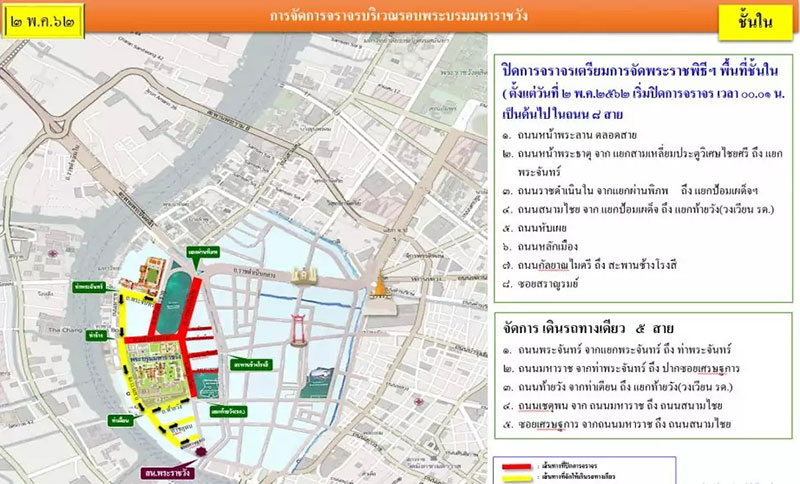 ขณะเดียวกัน การปิดถนนในช่วงพระราชพิธี จะเริ่มตั้งแต่วันที่ 2 พฤษภาคม เป็นต้นไป โดยปิดถนนบางส่วน แล้วก็เพิ่มขึ้นเรื่อย ๆ จวบจนจบงานพระราชพิธี มีรายละเอียดทั้งหมด ดังนี้