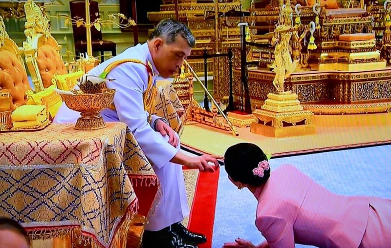 จากนั้น พล.อ.หญิง สุทิดา เฝ้าทูลละอองธุลีพระบาท ทูลเกล้าทูลกระหม่อมถวายกรวยกระทงดอกไม้ ธูปเทียน แพร แด่สมเด็จพระเจ้าอยู่หัว โอกาสนี้สมเด็จพระเจ้าอยู่หัวพระราชทานน้ำพระมหาสังข์ ใบมะตูม และทรงเจิมสมเด็จพระราชินี