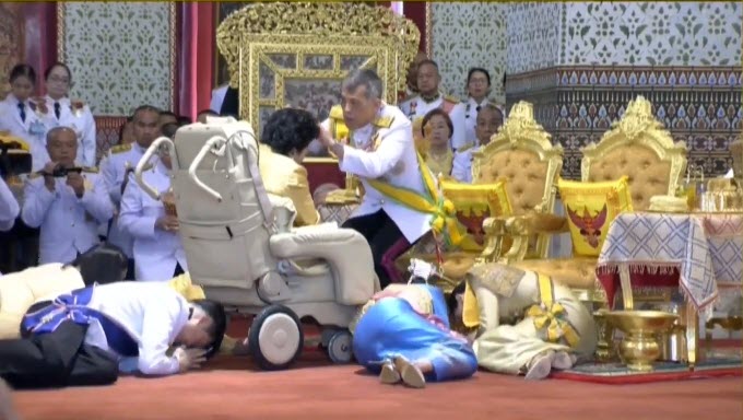 สมเด็จพระนางเจ้าฯ พระบรมราชินี ทรงก้มกราบ พระองค์เจ้าโสมสวลี ขณะสถาปนาพระยศใหม่ ทรงทอดพระเนตรและแย้มพระสรวล แสดงพระจริยวัตรงดงามยิ่ง
